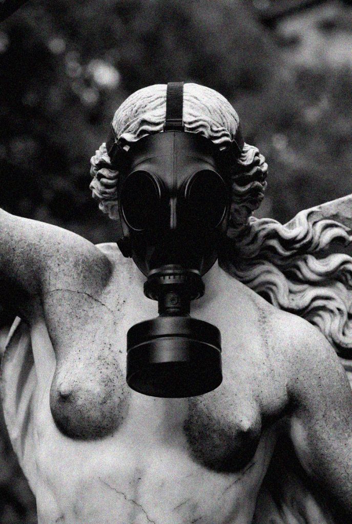 Die Gasmaske verdeckt das Gesicht, aber nicht die Haltung.